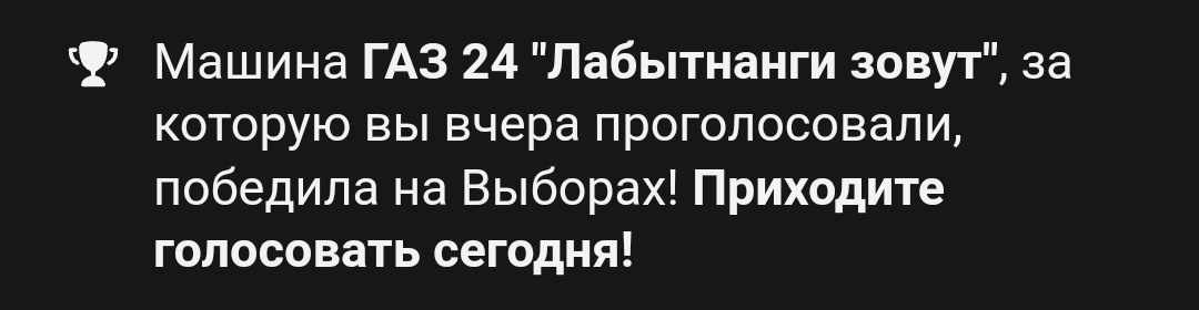 Здравствуйте! Вчера не заходил на Драйв, а с утра гляжу, машина дня красавица Волга. Зашёл бы вчера, проголосовал бы в Вашу пользу. Лайк, подписка!