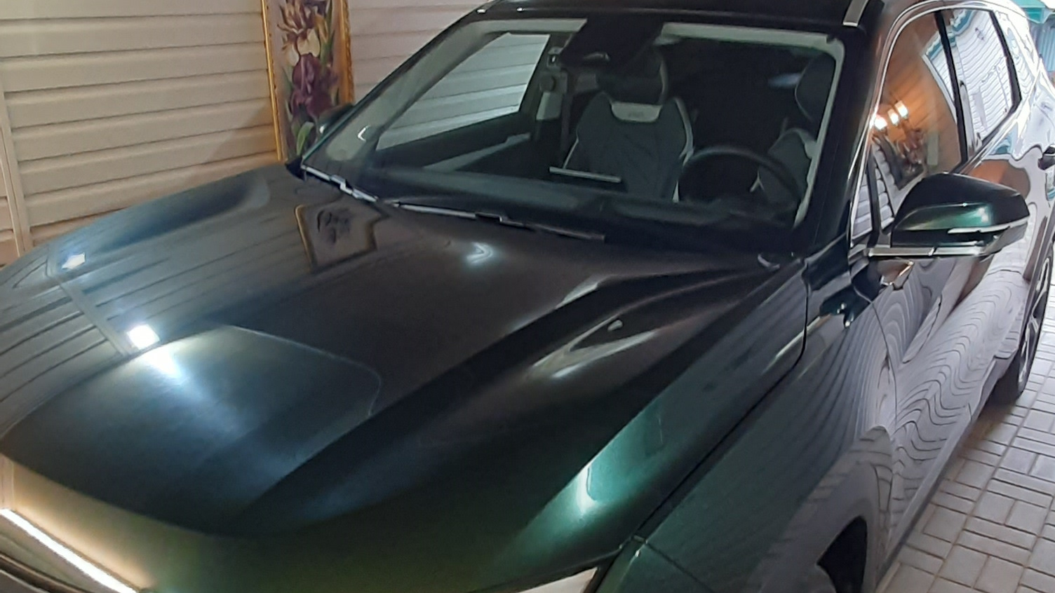 С выбором новой машины сомнений не было и цвет понравился — зелёный. Заказал комплектацию Флакшип и через 2 недели поехал забрал. Оформил Каско на всякий случай так как машина всё таки дороговата и запчасти соответственно. Из допов подарили: защиту картера, сетку в радиатор, тонировка и антикор. Дополнительно посьавил сигнализацию StarLine s97 с меткой и отслеживанием на телефоне, комбо регистратор iBox, Eva коврики на полный привод, купил зимнюю резину шипованную 235/55 r19, литые чёрные диски и датчики давления, установил пневмоупоры на капот, дополнительную светодиодную ленту подсветки в багажник, резиновый коврик в багажник,