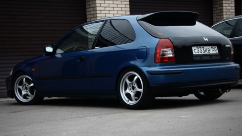 В апреле 2007 года купил обыкновенный civic 1.4 is 90 л.с. Еще до покупки был настроен на тюнинг. Первое что я сделал, это купил койловеры( винтовую подвеску) D2 и занизил машину. Выглядеть и управляться стала совсем по другому. Затем поставил задний стабилизатор от сивика VTI (рулежка стала еще приятней) Так и проездил лето. Осенью 2007 г. рассматривал варианты с заменой двигателя. Остановился на варианте B20vtec (блок B20b + ГБЦ от B16a), так как объем 2 литра и запчасти можно собирать постепенно. К июню 2008 г. все для замены двигателя было собрано и в конце месяца я его с друзьями установил. Конечно объем два литра и втек это что то. Получилось около 180 л.с. и 180 н.м. На этом останавливаться не стал, стал собирать запчасти для турбовки. В начале лета 2009 г. собрал другой двигатель и установил в машину, а после обкатки уже прикрутил турбину и настроился.