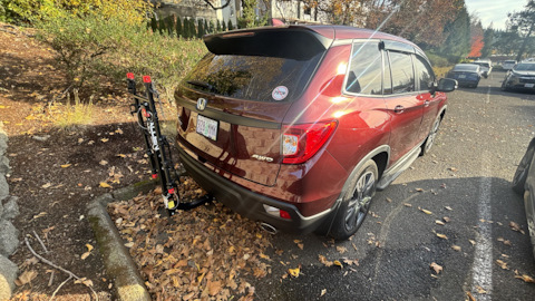 На паспорт вышел случайно, как то не обращал внимания на данную модель . После очередного трипа пришел к окончательному решению о смене, любимой женой, срв гибрид на авто с более мощным мотором . В наличии новых авто было мало, хайлендер гибрид дороговат, увидел паспорт по адекватной цене . За срв на волне спроса на гибриды дали больше на 5 тыс, чем брали 2 года назад . В подарок шли набор полный ковриков и пороги . Комплектация предмакималка, в принципе все что надо есть — двух зон.климат, электропомощники, эл дверь, люк, кожа натуральная, память сидений, светодиодный автосвет, автокруиз. Нет беспроводной зарядки, вентиляции сидений и чего то еще . Не критично . Мотор классический 3.5 6 цилиндров, 9 ступка от ZF . Полный привод . Технически близнец пилота, только чуть короче и соответственно 5 мест . После срв места просто навалом, особенно в багажнике . Иногда в срв его не хватало, тут еще ни разу под завязку не забивали . Срв лучше рулится, ближе к легковой, тут чувствуется больший вес, тяжелее в повороты входит . Но на трассе устойчивее, ветер вообще не беспокоит . И значительно комфортнее в плане шумки и плавности хода . Сиденья так же удобнее, вроде тут от Одиссея стоят . В дальней дороге спина не болит, как в срв. Единственное что не нравится это 20 колеса. Конечно смотрятся хорошо, но дают жесткость на некоторых неровностях и с трассы съезжать боязно. Паспорт в версии trails идет на 18 более внедорожных, в те я думаю в самый раз . Дороги тут не особо ровные для 20. У меня несколько знакомых на аккордах тоже думают о переходе с 19 заводских на 17-18 размер . Ну и zF 9 ступка неизвестный для меня зверь, иногда работает не в попад . В новом поколении они сменили ее на свой хондовский 10 ступ. Хотя такой же тандем 3.5-9 стоит на акуре мдх предыдущем и еще где то, по надежности вроде норм . Посмотрим. Подарочные коврики, как часто бывает, полное гумно оказались . Купил фирмы Oedro, чуть подороже но из толстой резины и с отливами прикрывающими пластик на порогах . Так же встали они идеально по форме, на стандартные крепления . В общем хорошие, рекомендую. Установил hitch, купил на Амазон. И в него воткнул крепление на 4 велика. Обзорность как в минивене, зеркала здоровые, все видать . По размерам он не такой уж и небольшой, по мне так здоровый . Особенно по ширине . Разгон нормальный, хватает . Но тут и гонять негде, главное тянет в гору спокойно . Там где срв визжала 2.0 литрами, паспорт едет легко и не больше 2.5 тыс оборотов . В основном всегда работает до 2 тыс, на трассе в среднем расход 26-27 миль на галлон . Вроде где то около 8 л на сотню, для таких габаритов я думаю это отличный результат, срв гибрид на трассе так же почти ел . В городе конечно все хуже, после гибрида . Но не прям критично . Тем более авто больше надо для путешествий. В общем авто нравится все больше и больше . О замене никаких мыслей и нет, да даже если и были бы то на что менять ? У тойот цены космос, а другие марки и не хочу . Японовод я, а щас скорее хондавод. Хонда в своих моделях не так экономит открыто и явно как тойота, там все как то печально все стало в плане качества материалов . Оно и так не было премиальным, но стало вообще какое то «китайское «.