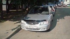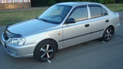 Авто куплено в июне 2011 года с пробегом 41 тыс. км.Многие меня уверяли что авто 2003 года не может быть с пробегом в 41 тысячу, а нет, может!Акцент искал очень давно, смотрел машин 20-25, но без слез на них не глянешь.Все битые, крашеные и т.п.И тут подворачивается случай знакомая бабушка продает свой(а уже мой)акцент в комплектации АТ-5!То что нужно!Машина не битая, собственно не крашенная!Зимой ни разу не выезжала из теплого гаража.Стало быть соли и подобной мути она не видела.В один замечательный день акцент приобрел нового хозяина, сразу же были заменены расходники с ремнем ГРМ.На авто стояла родная резина КАМА-205.После покупки почувствовал что зад авто немного мотает, оказалась что резине пришел конец.Долго не думая пошел да купил новую резину Гудиер Дурагрип и комплект новых литых дисков Теч-Лайн 324 Блэк Диамонд.Ну что думаю нужно обкатать свой первый автомобиль(до ацка ездил на родительском авто Додж Караван 2.4 л и далее Крайслер Себринг 2009 года).В первые же выходные поехал в деревню 330 км в одну сторону.Машина очень приятно удивила всем!Двигатель достаточно резвый хоть и автомат, подвеска работает отлично, ямки проглатывает на ура!Ничего не дребезжит, вообщем тишина!После поездки решил сгонять авто в сервис потрести подвеску что бы быть в курсе что нужно менять.Подняли на подъемник всю осмотрели, протресли всю ходовую и приговорили к замене только втулки стабилизатора, остальное все гуд!Ну думаю вот и замечательно.Сейчас заливаю только бензин и получаю удовольствие от поездке на данном авто.Единственный минус на сегодняшний день это родная музыка(кассетный магнитофон и динамики не понятно какого качества).Конечно со временем все сделается, а так радио играет нормально=)Никакого тюнинга делать не собираюсь, максимум только покрасить в цвет кузова все черные детали.Гонять не люблю, я ценитель комфортной езды!