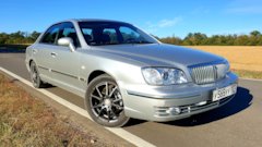 Корейский бизнес-седан, чтобы быть востребованным, вынужден маскироваться под конкурентов, и получается это у него довольно неплохо. Определить «национальность» Hyundai XG с первого взгляда не получится. Фирменная эмблема присутствует только на крышке багажника. Длинный капот, заканчивающийся почти квадратными фарами, массивная хромированная решётка радиатора, молдинги и ручки дверей напоминают европейский автомобиль. Корма с вертикальными фонарями, мощным бампером и приподнятой, красиво изогнутой крышкой багажника делает машину похожей на классического чопорного «англичанина», ну а при взгляде в профиль сразу замечаешь двери без рамок для стёкол — на седанах такое встречается или у «американцев», или у «японцев».