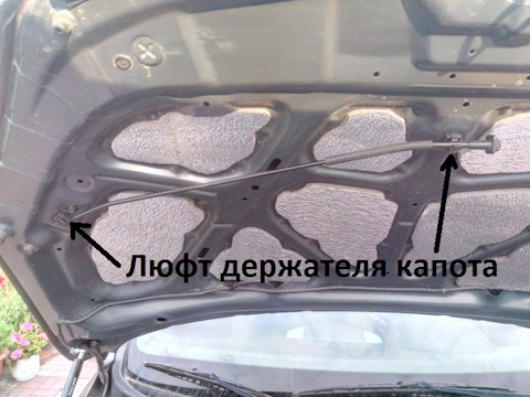 Штатный держатель капота в своем крепежном месте дребезжит. Проверить легко, достаточно по нему слегка постучать. Причем в двух местах (на фото показано)