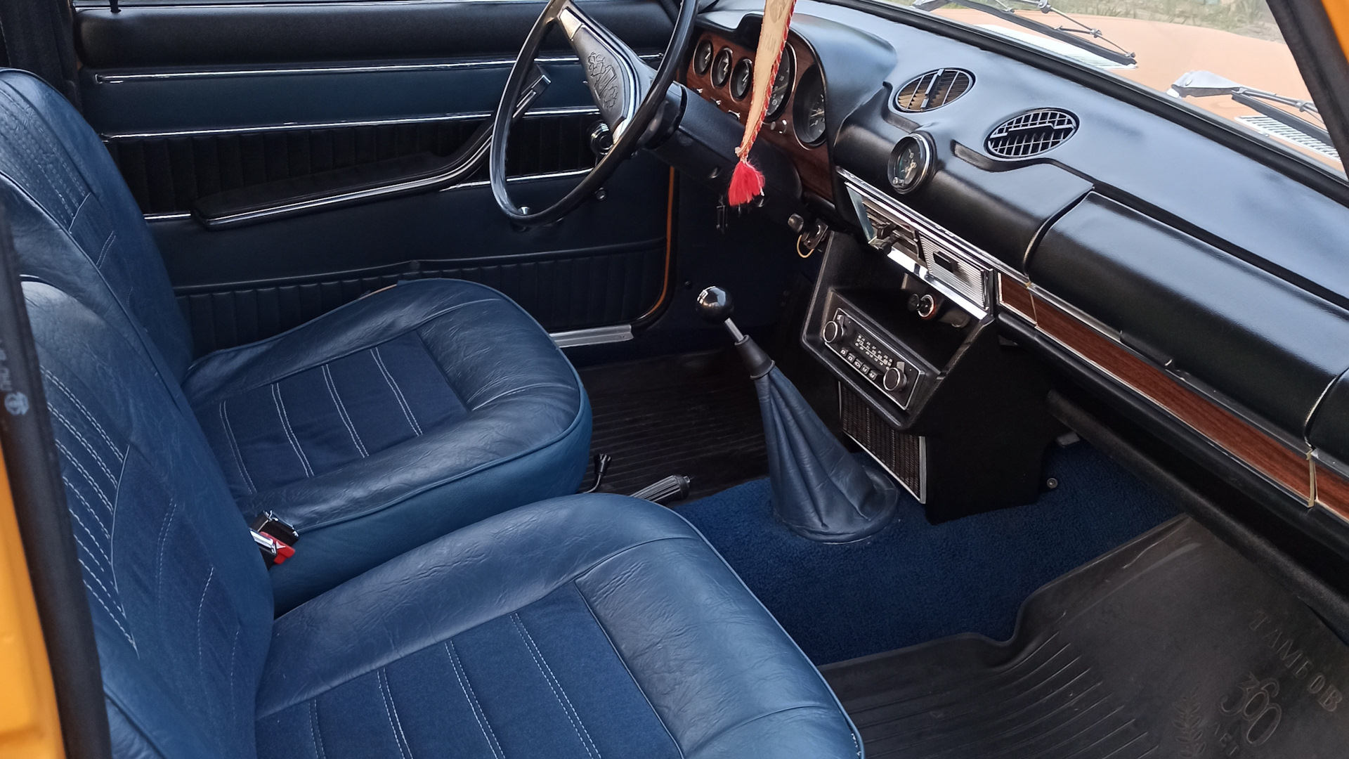 Машина практически комплектна при покупке была. Отсутствуют клыки переднего бампера (уже нашел где взять), решетка радиатора установлена пластиковая от ВАЗ 2106 (уже заменил на оригинал), на передних сидениях нужно восстановить тканевые вставки (увы, время не щадит ничего — но восстановили салон уже). Отсутствуют хромированные накладки на арки ("серпы" — пока ищу, нашел, теперь ищу идеальные) и на пороги (тоже ищу, аналогичная история, как с серпами). В остальном минимум какого-то колхоза.
