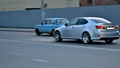Обычная шесть голубого цвета с багажником на крыше и с табуном коней под капотом