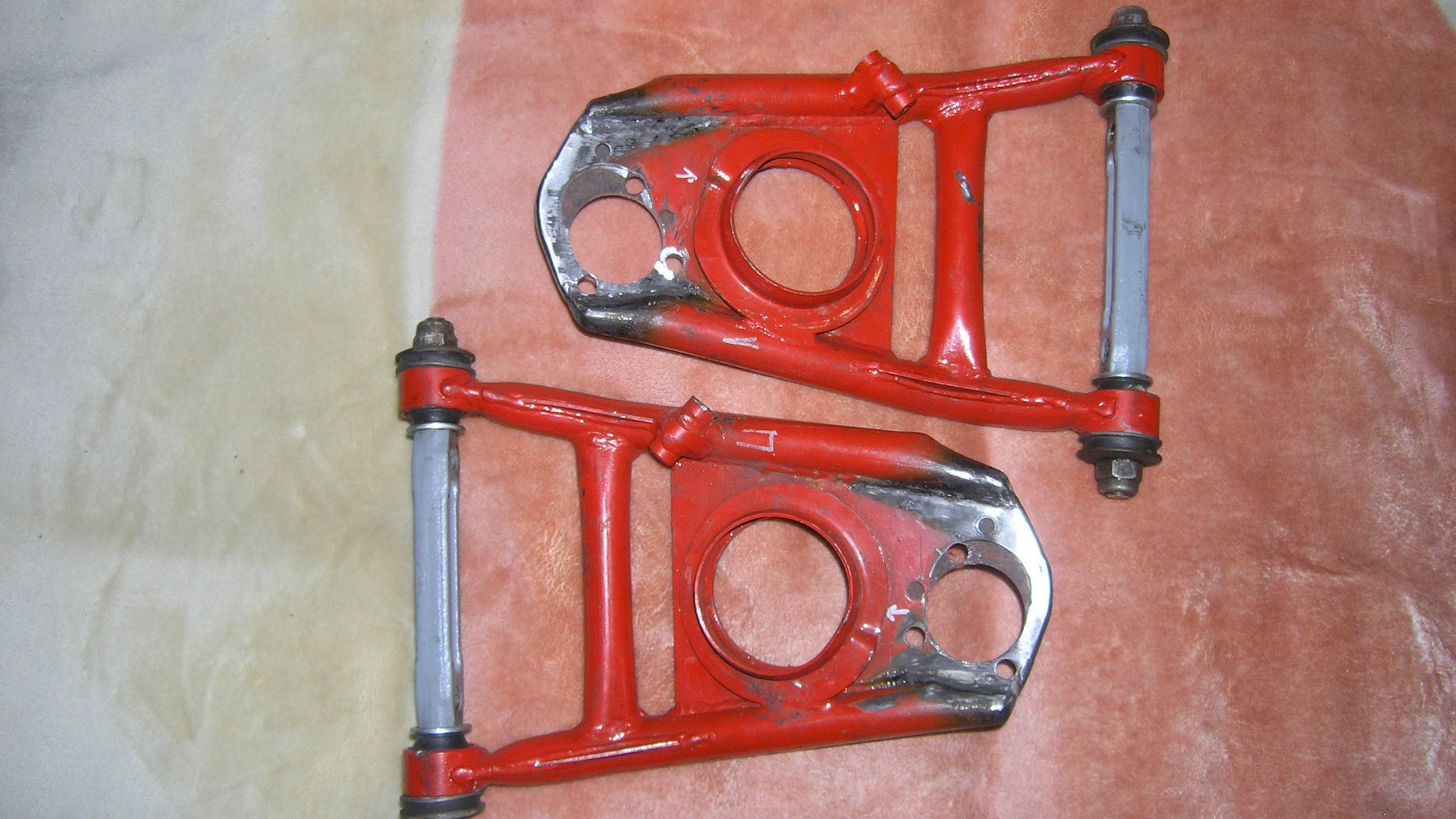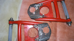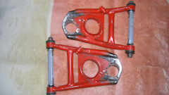 Рычаги Stinger, переваренные под кастор 7 градусов (15 было слишком много, машина на скорости более 110 слишком резко реагировала на руль).