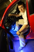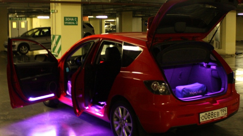 -RGB лента в багажнике, на дверях, и в ногах. Работает только там где открывается дверь и сейчас постоянно меняет цвет =)
