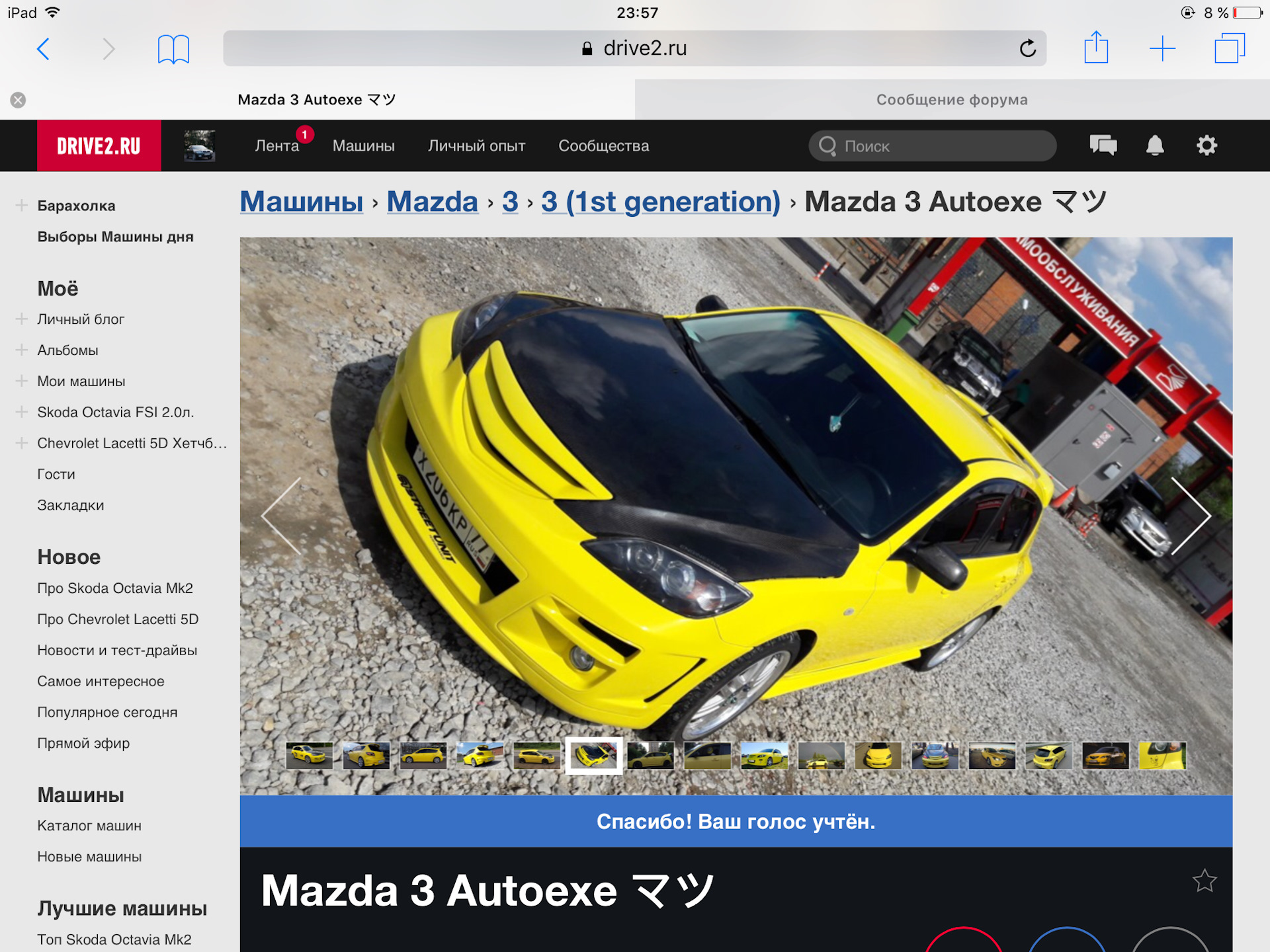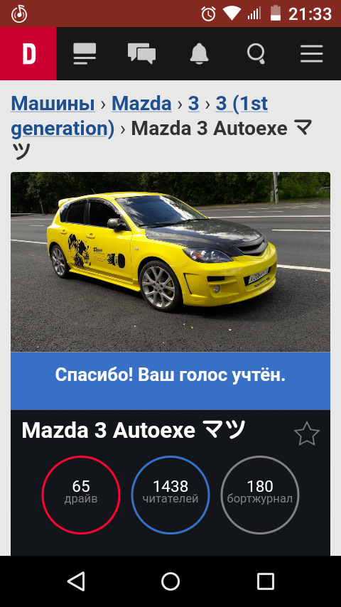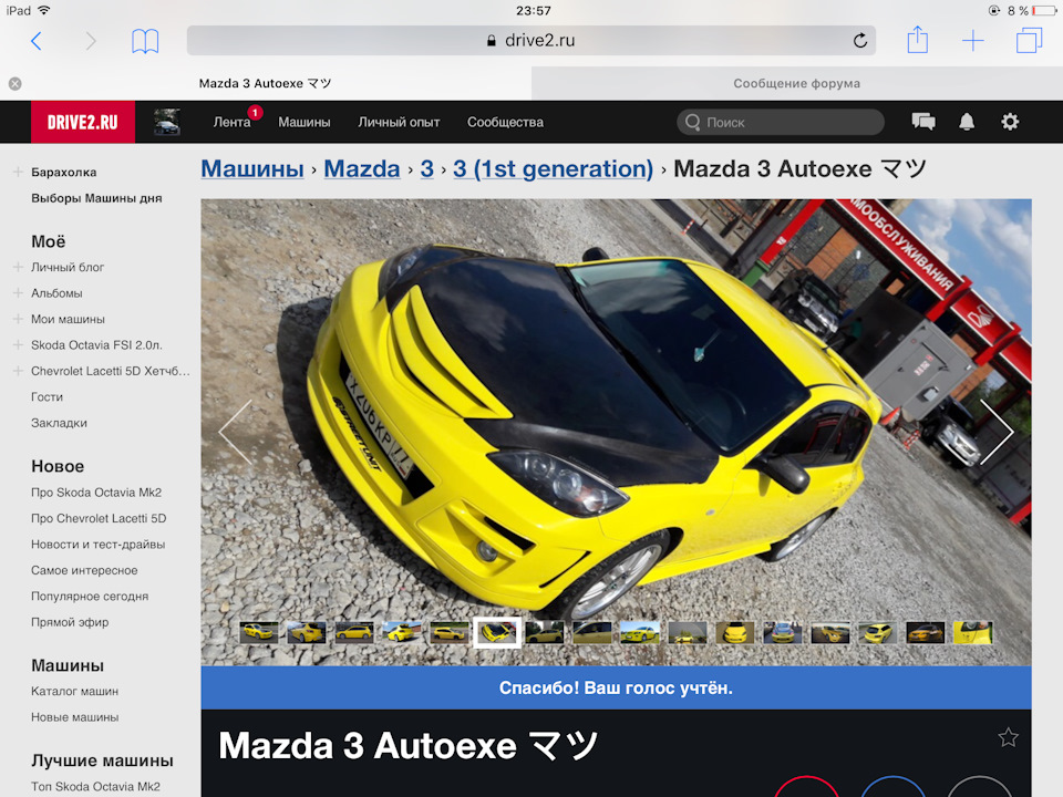 Даже не знаю что писать, после прошлой мазды вопрос о выборе какой-то другой марки не стоял, так как я считаю что в данном ценовом сегменте она лучшая. Искали с супругой исключительно желтую, потому что давно хотели. Каждый день мониторил сайты с продажей авто, а как то раз зажожу на авто.ру, и вижу ее она была прекрасна. Звоню хозяину им оказался вполне приятный парень, который все в подробностях про машину рассказал. Договорились о встрече и уже через 1час мы выдвинулись в г.Голицыно. Результат встречи превзошел все ожидания, и вот уже месяц как она радует нас своим появлением в семье.