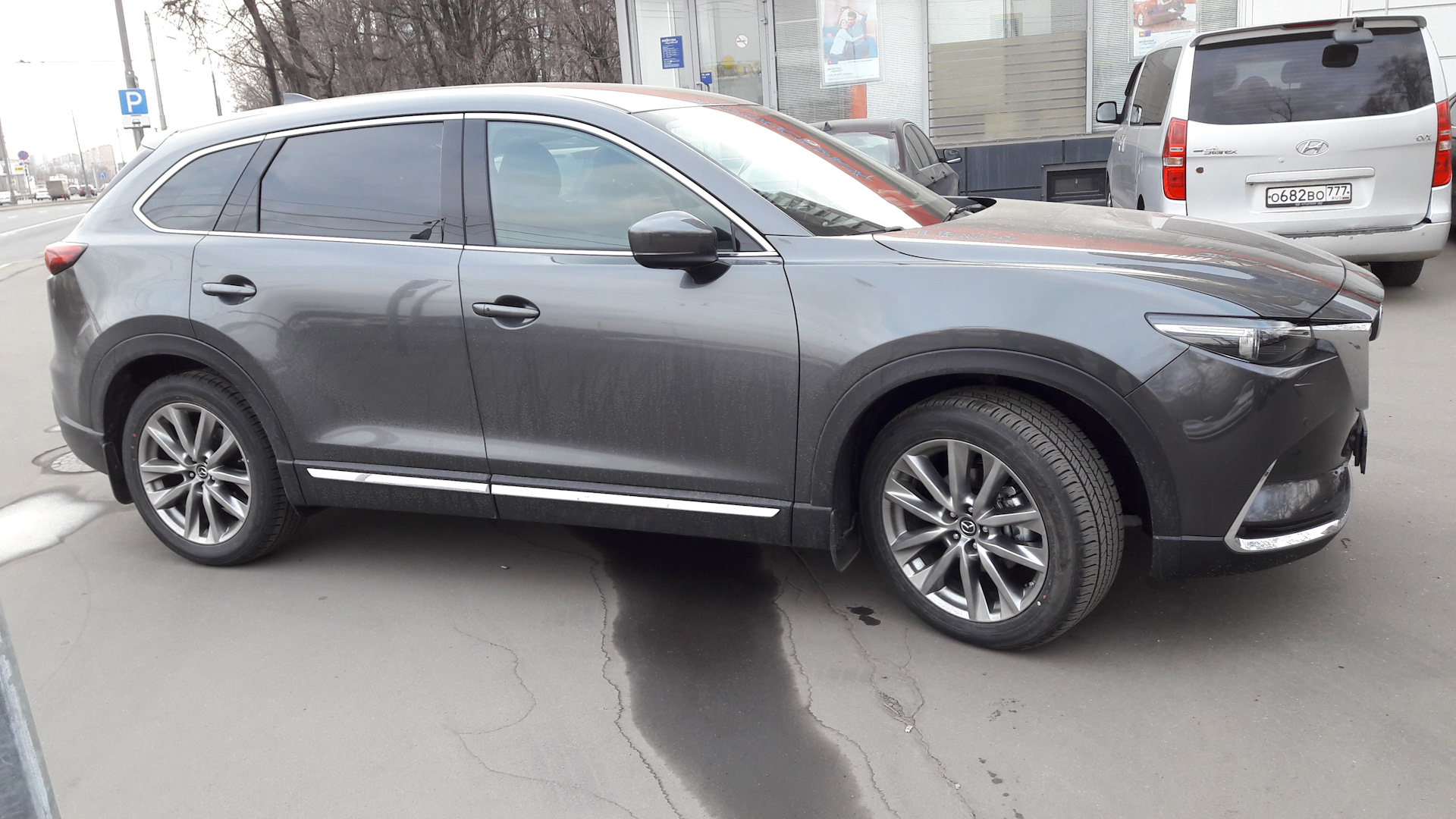 Выбор машины на смену Солярису происходил около полугода. Изначально на повестке дня был Hyundai Santa Fe 4 либо KIA Sorento Prime, тестировал обе машины и о Мазде СХ-9 не помышлял. Рассматривал дизельные двигатели, но постепенно пришло осознание того, что дизель особо-то мне и не нужен — авто эксплуатируется не часто, следовательно экономить на топливе смысла нет, соответственно зачем тогда мне связываться с отрицательными сторонами эксплуатации дизеля, утомлять перечислением не буду, их все знают. Мазду поехали смотреть "для галочки" в ноябре 2018. После тест-драйва и изучения салона Мазды в корейцев возвращаться желания не возникло ;-) Единственно, на первом тест-драйве показалось, что ближний свет СХ-9 не очень, вероятно на фоне KIA Sorento Prime, фары которого лупят прилично. Но сейчас, поездив достаточно в темноте уже на своей машине, могу сказать, что свет приличный. Затем был второй тест-драйв у другого дилера, толкаясь на тесте в пробках, понял, что лично мне на этом не маленьком авто не хватает камер 360. Решил ждать машин 2019 г.в. Дождался, посмотрел камеры 360 и был сильно разочарован — картинка размытая, и общая картинка разделена линиями на 4 сектора, что затрудняет восприятие (смотрел камеры 360 на том же KIA Sorento Prime, причем в тёмное время суток — явно лучше, на Мазде — днём — хуже). Плюнул и решил покупать СХ-9 2018 г. в. (забегая вперёд, скажу, что камер 360 — лично мне таки не хватает — недавно протискивался между рядами машин, выбираясь с тесной парковки — до соседней машины было около 2 см, пипец, еле разъехался). В процессе обсуждения условий со всеми дилерами, предложения по пресловутому трейд-ину отверг, чего и всем советую, ибо это грабёж среди бела дня — если есть монета на новую машину в необходимом количестве — старую машину продавайте сами, что я и сделал на днях, продав по максимально рыночной цене. Самые лучшие условия на Мазду за топ комплектацию "Exclusive" 2018 г.в. цвета Machine Grey предложил "Автомир" на Ярославке с допами: алюминиевая защита картера, сетка в бампер, пластиковые подкрылки, дополнит. антикор и антишум арок и днища, брызговики, дополнит. полиуретановые коврики на всю машину. Менеджер Михаил, рекомендую, он терпеливо отвечал на все мои распросы, а я клиент дотошный. На выдаче авто он принёс по моей просьбе толщиномер, ЛКП конечно у девятки тонкое — на дверях максимум 70 мкр, на крыше вообще не больше 50. На данный момент пробег около 200 км, самый низкий расход бензина, какой удалось увидеть по городу — 13,2 л. Добавлю наблюдение по расходу — самый низкий, какой удалось зафиксировать 12,5 л (пробег около 480 км).