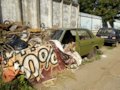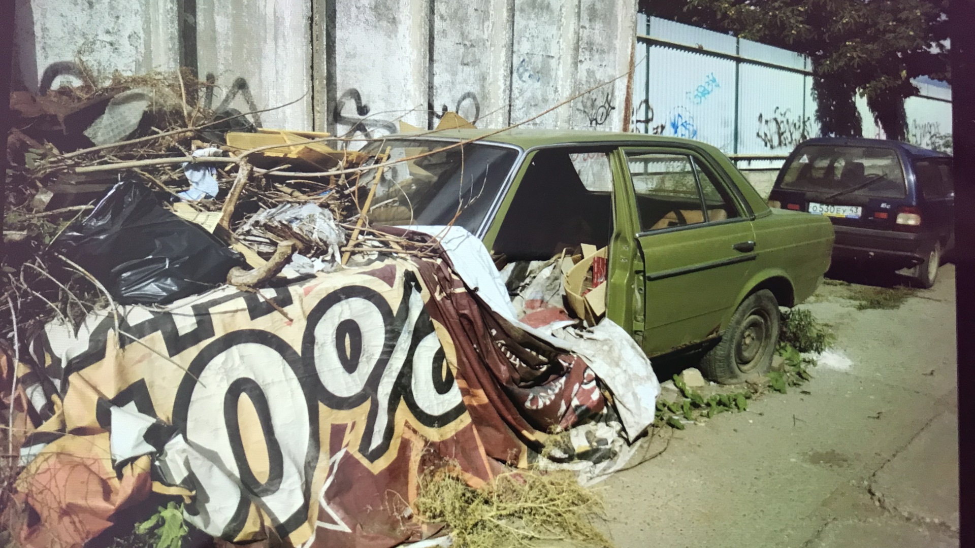 Увидел у гаражей на свалке этот экземпляр и решил купить на запчасти, как донора для другого Мерседеса www.drive2.ru/r/mercedes/w123/596935584031722503/. Двери водительской и крыла нет, капот исхерачен молотком или ломом, в салоне рассыпан мешок цемента, накидан мусор, смёт из гаража, решётки радиатора и бампера нет, передних сидений нет, топливного бака нет, приводов нет. Руля нет. Вместо рулевой трапеции приварена дужка от железной кровати. Стартера, генератора, ТНВД и фильтров нет, топливных форсунок нет, низа дверей и крыльев дырявые. Спросил проходящего мимо мужчину про хозяина. Мне сообщили номер телефона хозяина ближнего гаража . И так по цепочке вышел на владельца. В дальнейшем оказалось, что этот металлолом ещё и с документами. Договорились на 25 т.р. ДКП составить не вышло, так как продавец сам такой не оформлял. Отдал ПТС и ДКП на прежнего владельца. Так же отдал новый глушитель, новое крыло, привода и какой то ТНВД. На следующий день с сыном очень экстремально на тросу отбуксировали этот металлолом к своему гаражу. Благо тащить было недалеко, 4-5 кварталов.