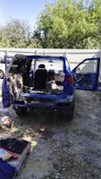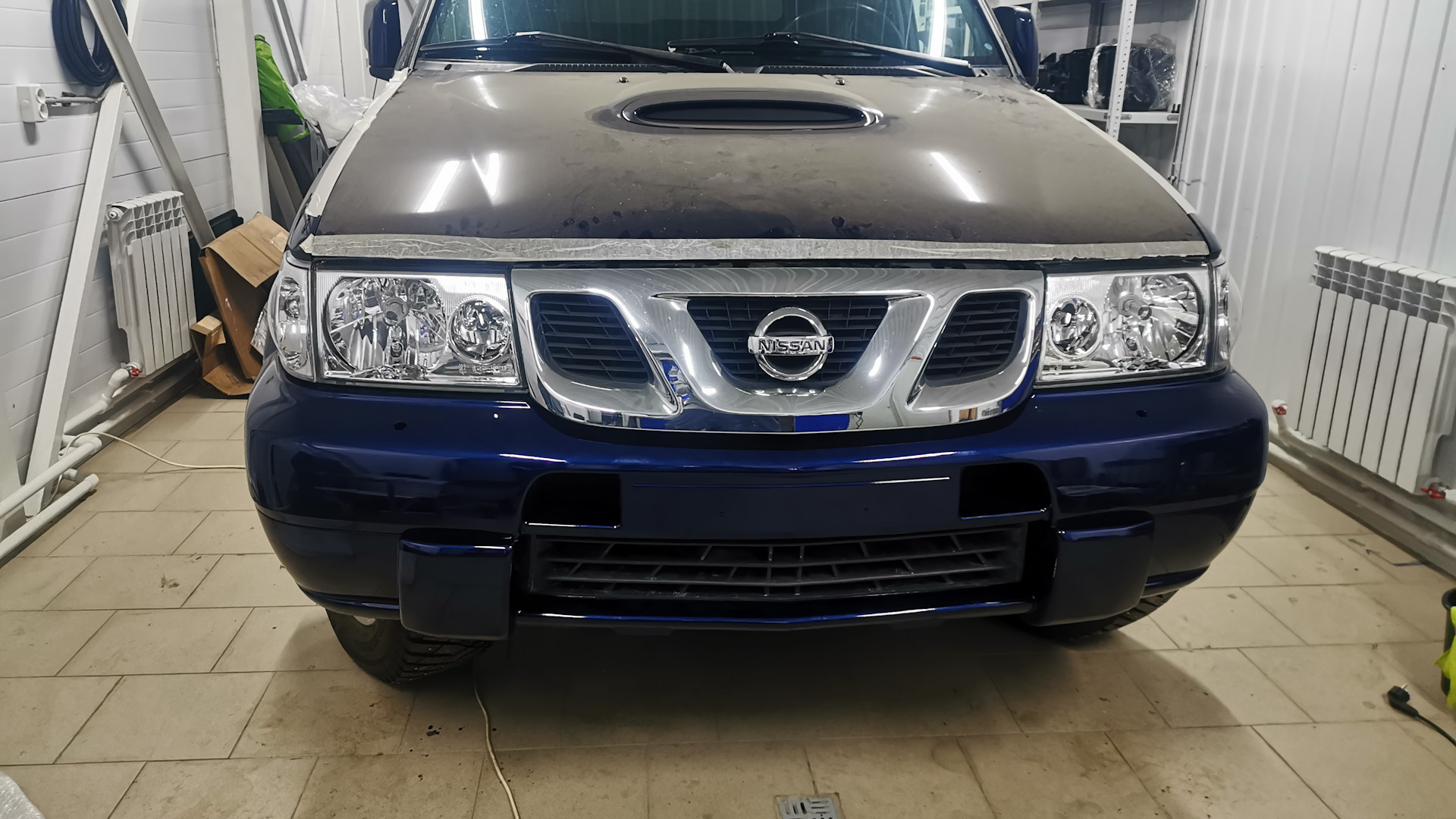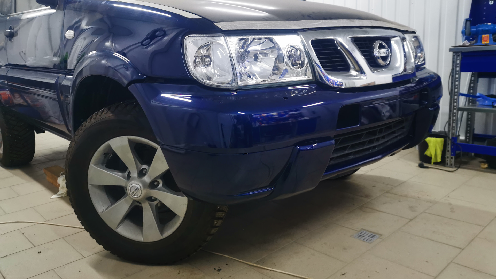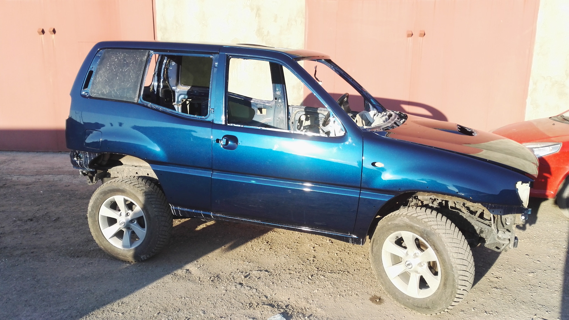 На данный момент (июнь 18) автомобиль перекрашен в новый цвет, за основу взят стандартный для Террано последних выпусков синий перламутр BW9, на основе которого подобрано реализованное цветовое решение. Впереди вклейка стекол и сборка автомобиля.