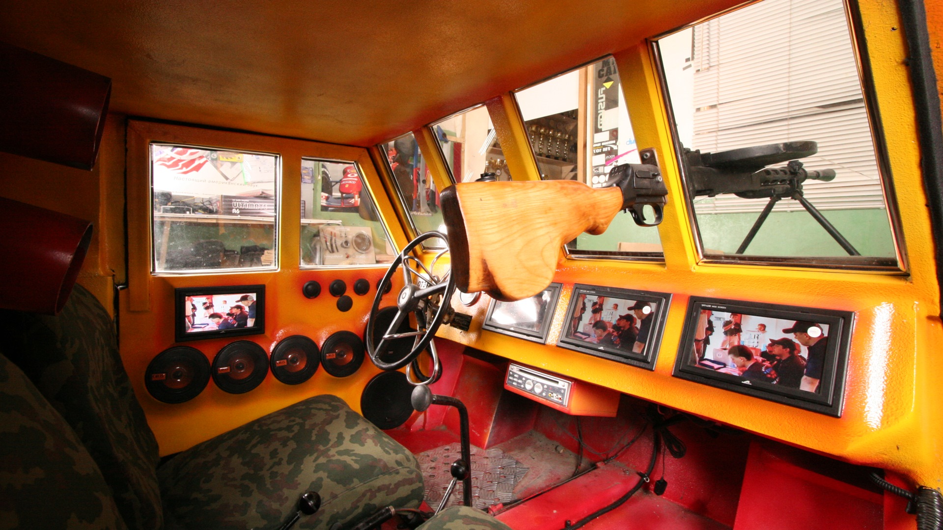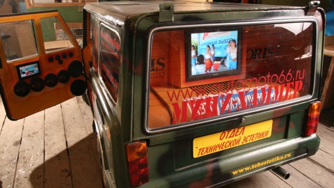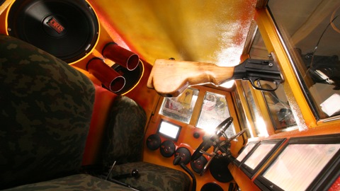 Это был ураганный по харизме проект. Инсталяция за четыре месяца тремя мастерами нашей студии. Заднее стекло с рамкой от Ваз-2104, колеса через проставки тоже от автомобиля Ваз.