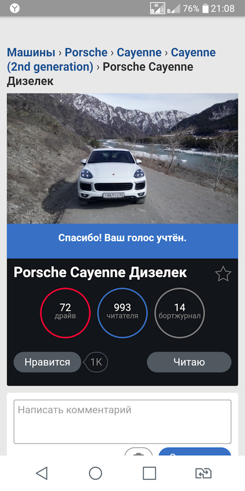 Приобретен взамен LX570. Первый мой дизельный автомобиль и первый Порше в моей жизни. При выборе замены Лексусу не на последнем месте стояла надежность поэтому взгляд пал именно на дизельную версию (судя по отзывам особых хлопот он не доставляет, надеюсь это так и есть), ну а комфорт, скорость, качество рулежки и отличная отделка салона это неотъемлемая часть в общем то легендарной марки Porshce. Пока проехал 800 км, первые впечатления такие: