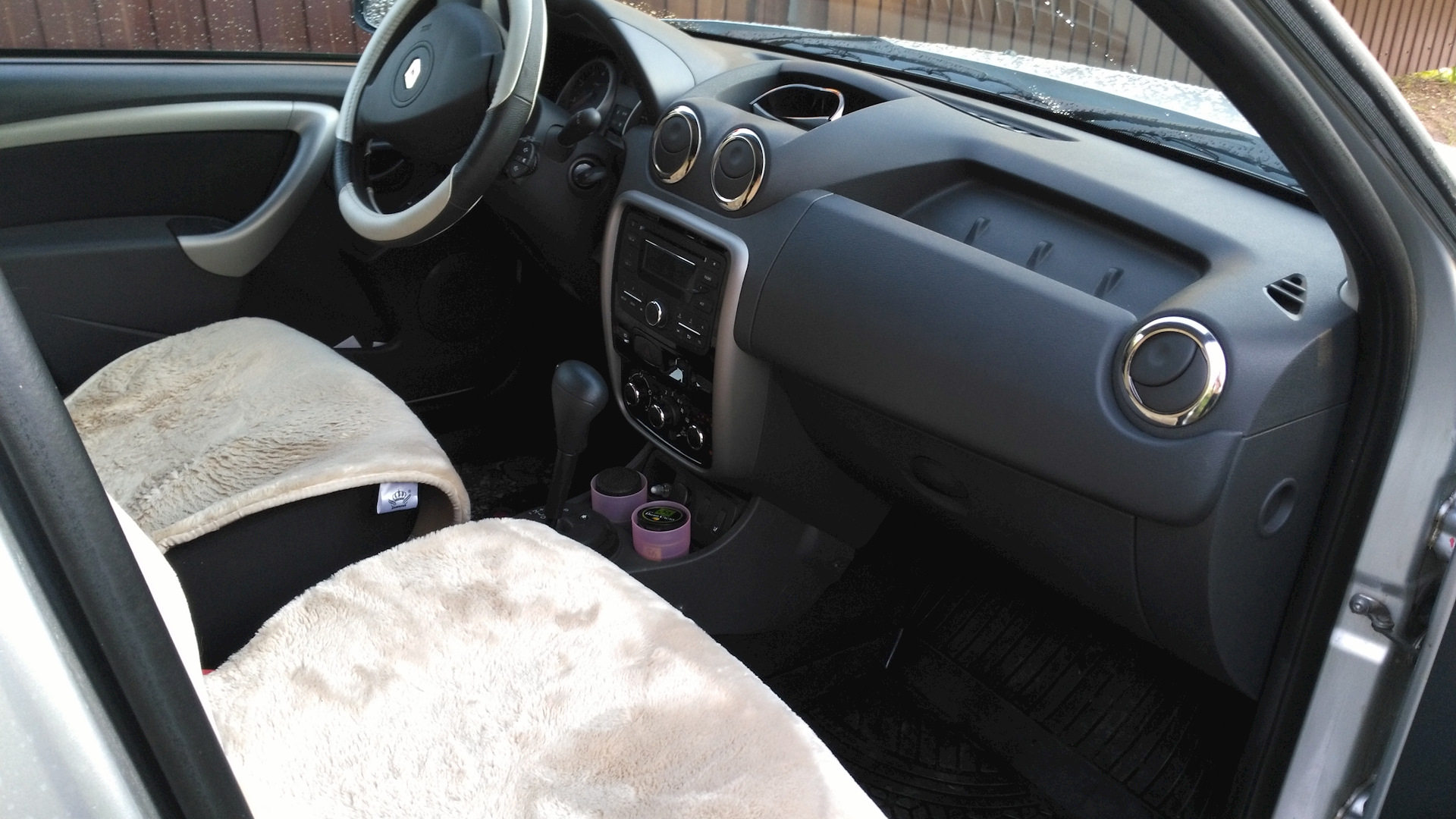 Вместо чехлов в салоне стоят светлые меховые накидки. Смотрится солидно! Дополню, что одной из проблемных частей кузова всех Дастеров является подарочное место рядом с задней дверью. Оно мной было сразу закрыто прозрачной пленкой, обезопасив в дальнейшем от пескостуя. Также передние брызговики дополнены накладками-брызговиками, после чего машина стала пачкаться гораздо меньше!