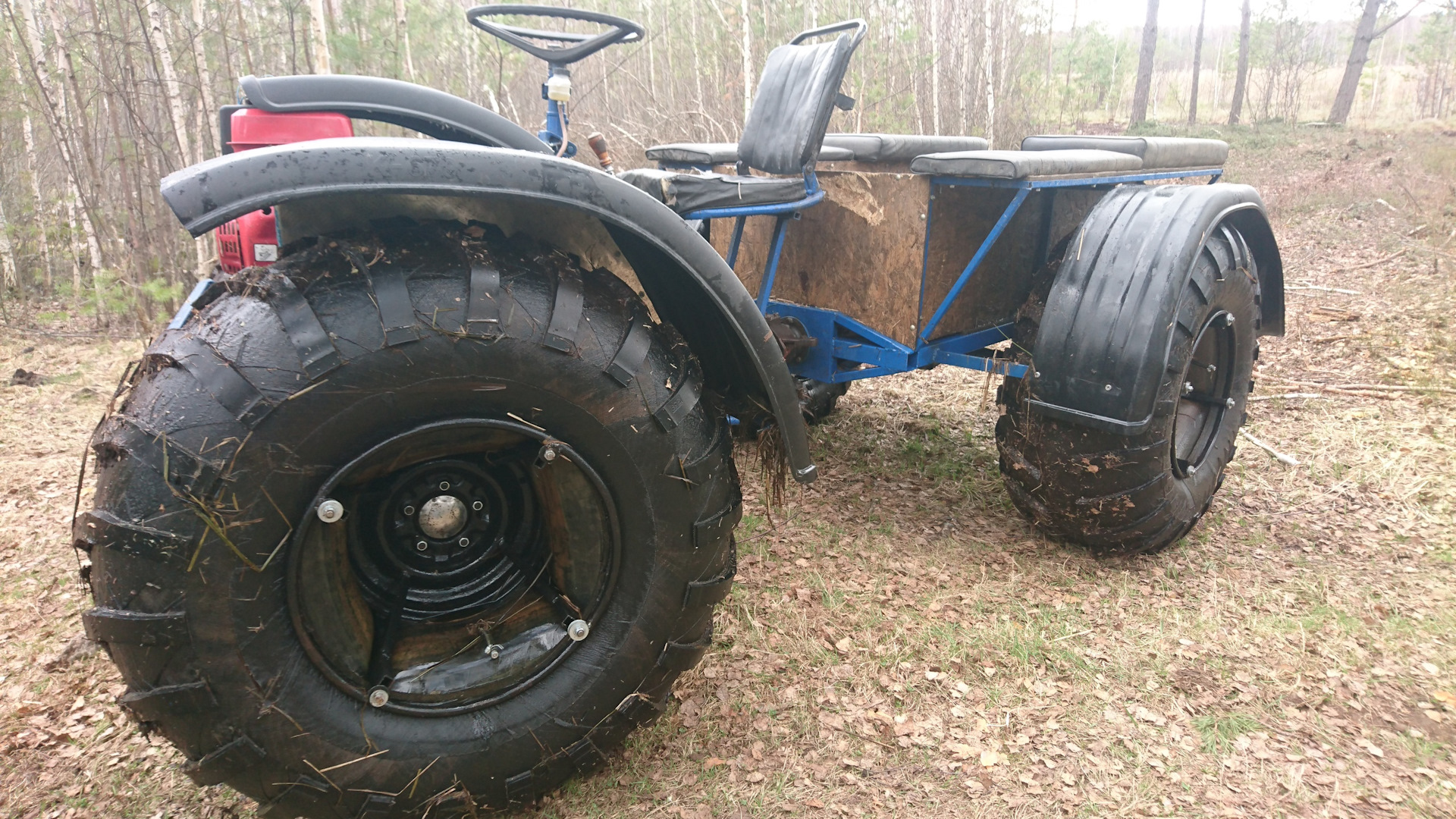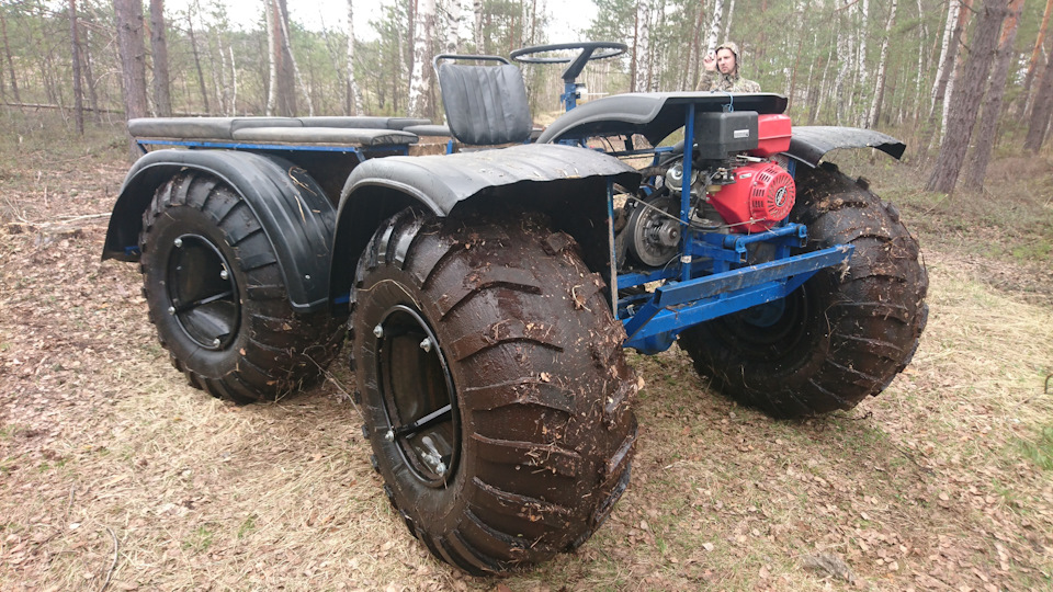 Каракат "КирКар", на шинах низкого давления. Вездеход, для которого нет преград, 4-х тактный двигатель 15 л.с. колёса обдирыши, самодельные каркасные диски, сидения в кузове на 6 чел.