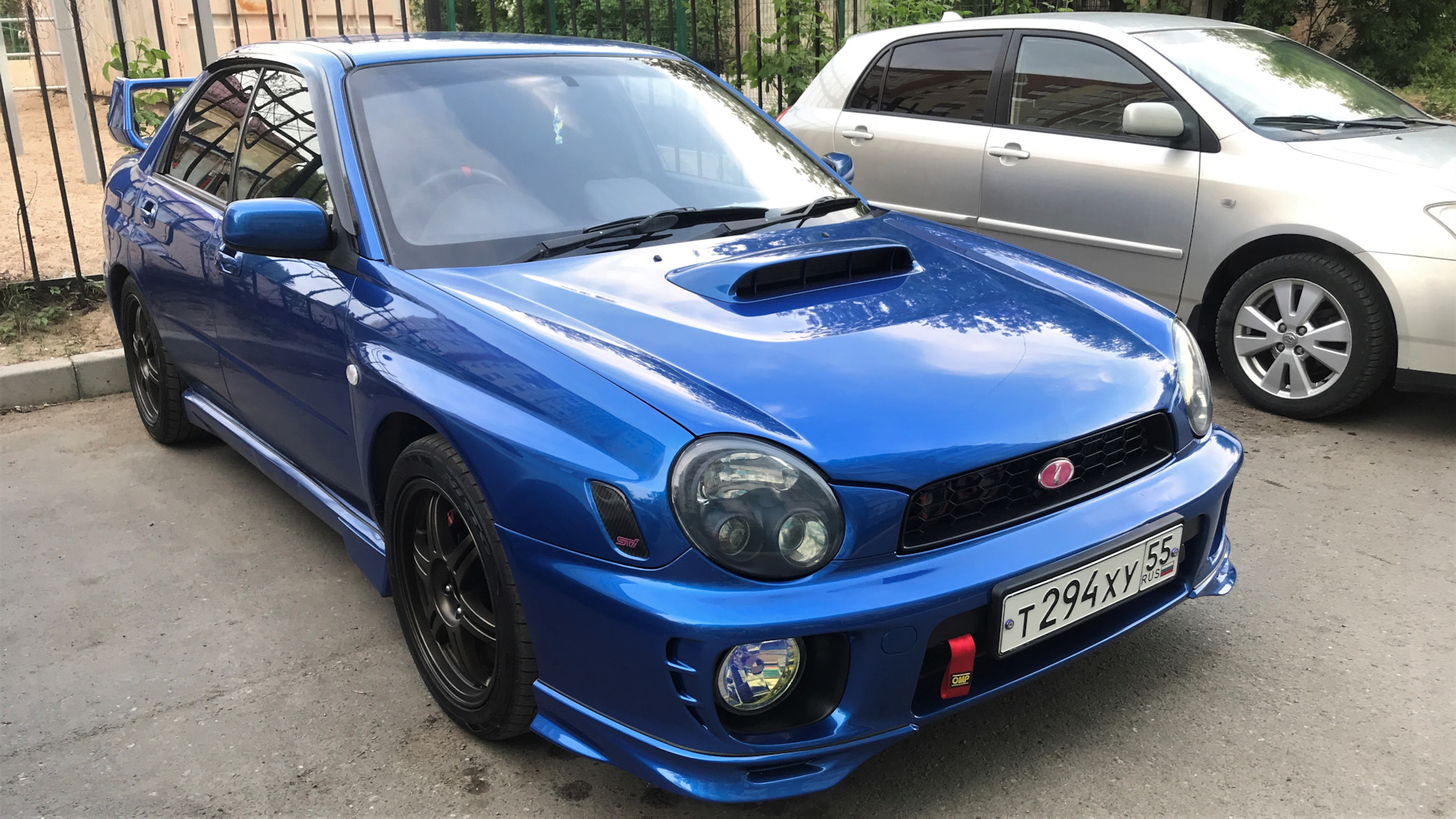 Exterior — спойлер STI, зеркала рестайл, ПТФ хамелеон, резиновая губа (перед), гудки Hella, воздухозаборник капота STI, накладки переднего бампера, подиум номерного знака GM, буксировочная петля OMP (реплика)
