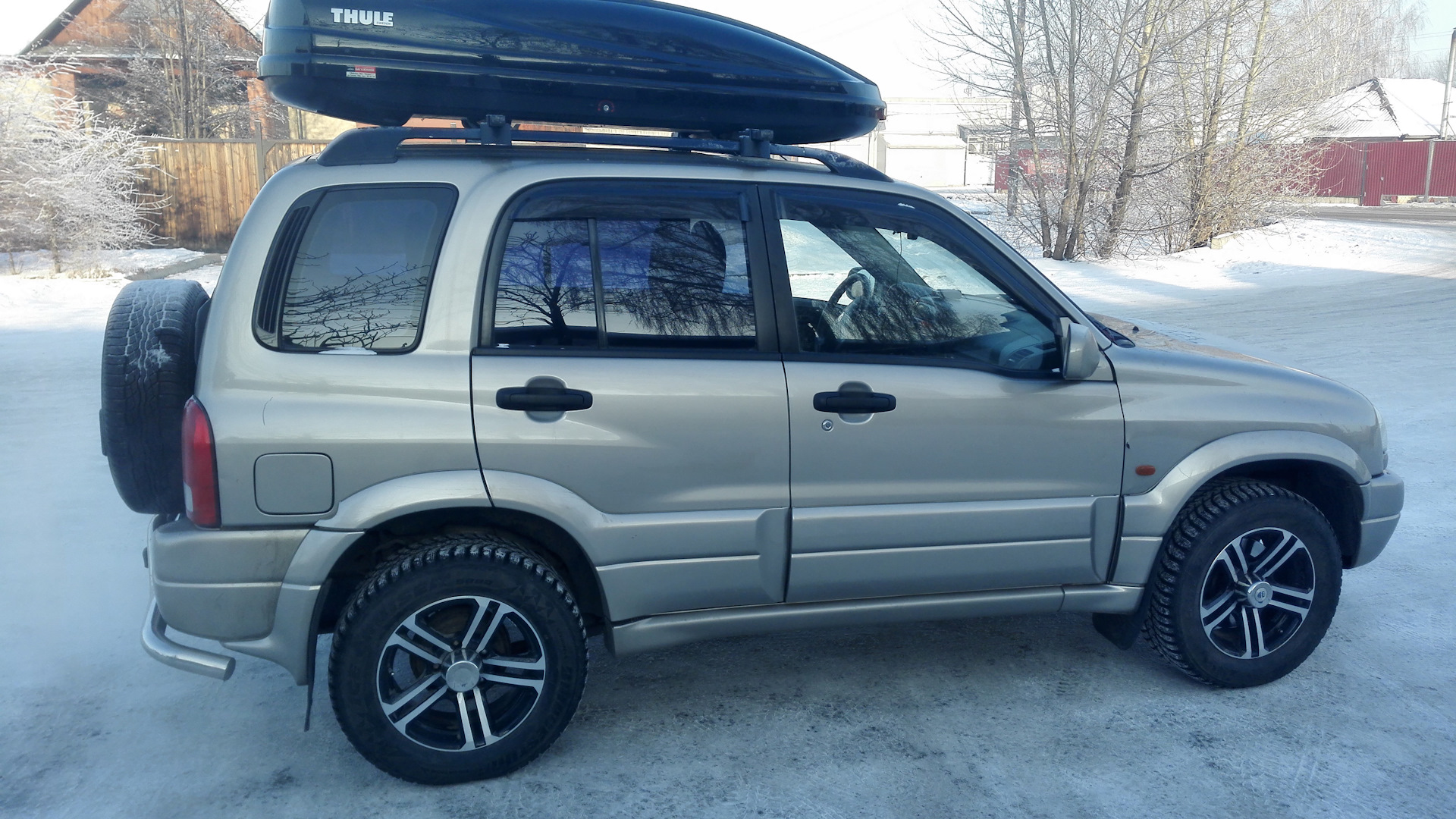 Бежевый сузук, круглая Витара 2004 года, на мехе, фаркоп, фонарь заднего хода на запаске, задний номер на запаске, лифтована 5см новосибирским набором, новосибирские передние разборные рычаги, резина 235х70х16 максис а/т, стойки стабилизатора из рулевых наконечников, пневмоопора задней двери от двенашки