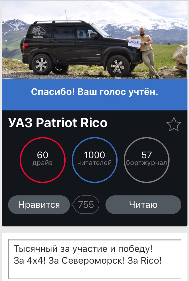 Завсегда за УАЗ! Удачи в выборах и интересных маршрутов! +1