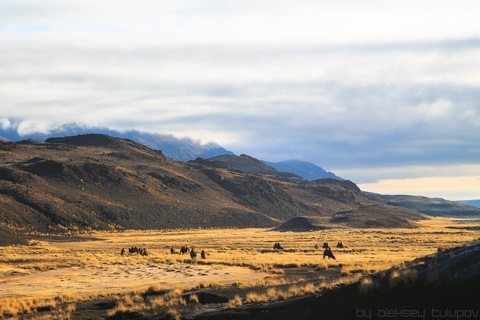 Проснулись мы хрен знает где. Ровная долинка, посреди сопок. Оно конечно красиво, но вот все таки не очень я понимаю, чего тут смотреть. Вдали правда, фотогенично пались верблюды.