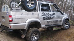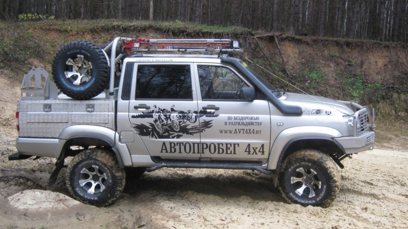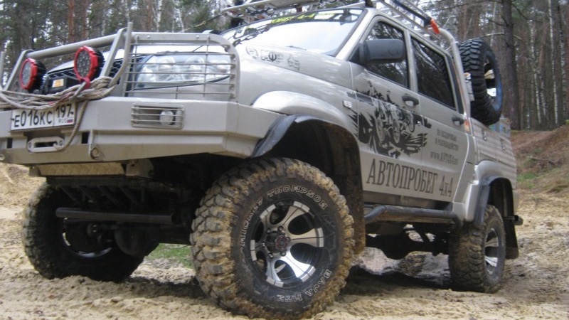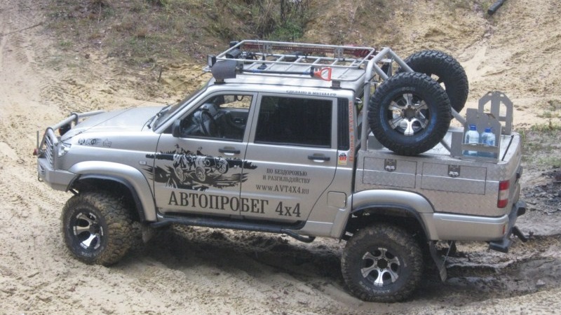Машину оснастили колесами размером 305х70R16, заменили главные пары на пары дизельных модификаций, установили шноркель .