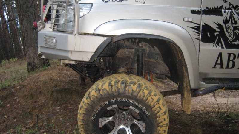 Кузов был отлифтован капролоновыми проставками на 60 мм. Арка переднего колеса вырезана, для последующей установки колес большего диаметра.