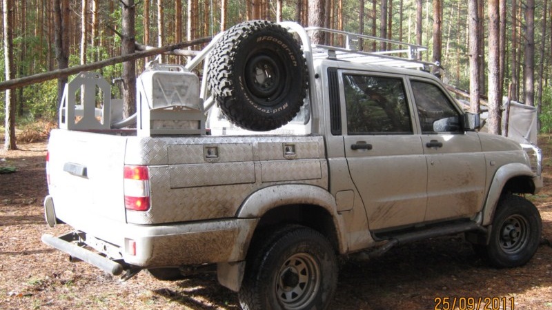Установка колес диаметром до 33 дюймов, серьезная доработка грузового отсека с изготовлением ящиков для первоочередных вещей в нишах над арками задних колес, размещение двух полноразмерных запасок, изготовление и размещение крепежей для канистр, установка экспедиционного багажника, лебедки, дополнительного и рабочего света.