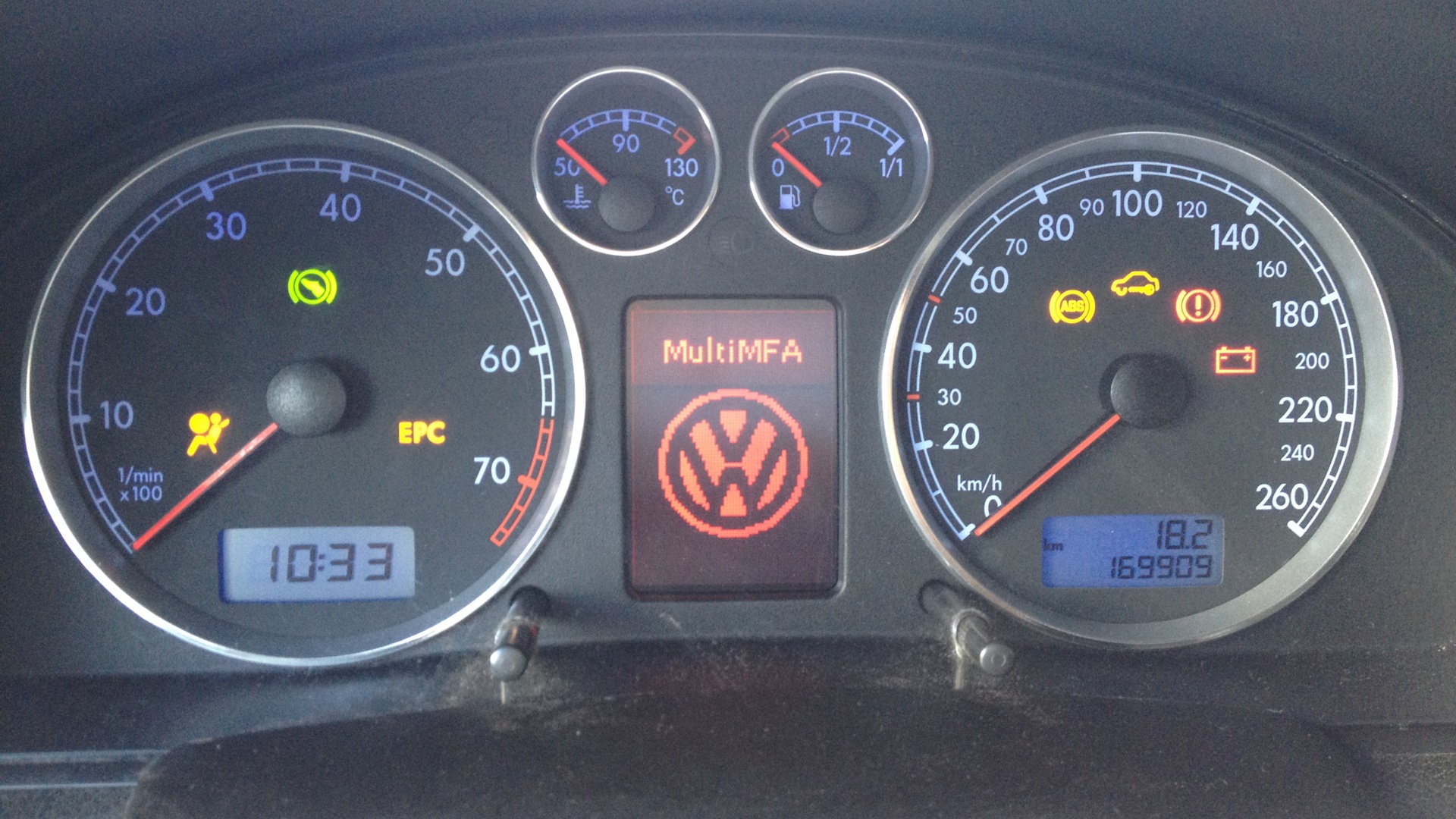 Поставил оба новых радиатора, новый телевизор, две новых противотуманных фары с решетками (в родной комплектации их нет), новый передний бампер и его юбку, также он заменил панель приборов на американскую (3B0 920 926B пробег наверняка скрутили.) и привязал к старым ключам. Прежнюю панель спалили ещё на севере, тогда же спалили блоки управления в передних дверях, которые я восстановил до заводского состояния.