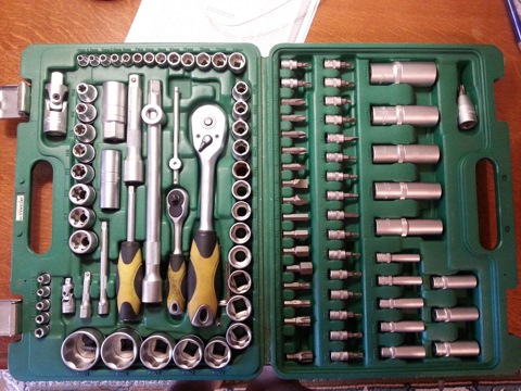 Для различных манипуляций с автомобилями несколько лет назад приобрёл вот такой набор инструментов, 108 предметов: