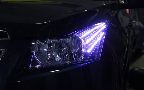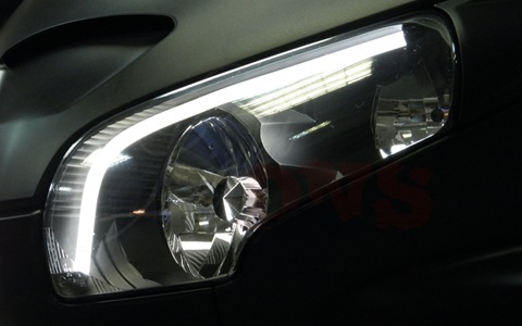 Светодиодные линейки сделаны на основе гибких плат DB1. Линейки покрашены серебряной краской с шагреневой фактурой, благодаря чему они идеально вписались в фары, подложки которых имеют аналогичную ша…