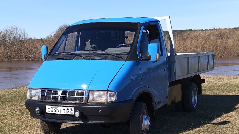 Собрал машину с рамы с простым не самосвальным кузовом. Начал ездить, возить, подшабашивать. Надоело лопатить (лень — двигатель прогресса))) решено сделать самосвал. За год было всё сделано. Снова год пошабашил, двигателя не хватало ездить по мягкому грунту. Поставил раздатку газ 66, чтоб была пониженная. И вот, машина попёрла как танк по огородам с полной загрузкой. Тут пришла идея установить передний мост (газелевский).